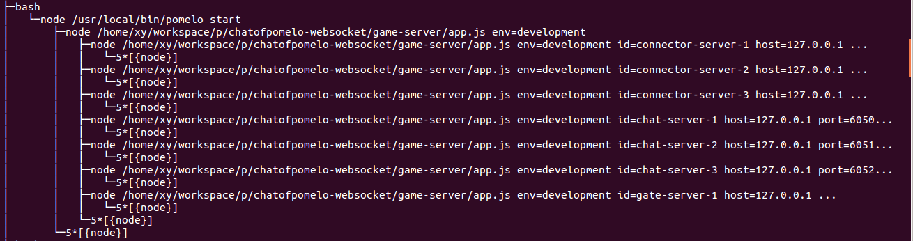 得到的进程树的一部分,我们从图上可以清楚地看出,pomelo start 调用进程会创建子进程,子进程执行的是 node app.js env=development,然后这个子进程又会创建很多子进程,这些子进程执行的跟原进程同样的文件,只是多了更多的参数,它们后面会有一些诸如id、serverType、port 等这样的参数。好了,现在我们可以做一些简单的解释了,pomelo start 的进程直接创建的那个子进程,实际上就是我们的 master 服务器进程,而由 master 服务器创建的那些子进程,他们执行的是类似于