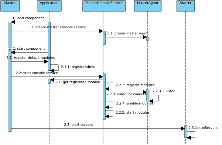 - 首先 app.start() 首先会加载默认组件,由于没有指定服务器类型,此时会默认为 master 类型,拿到 master 的配置信息,加载 Master 组件,由于 Master 组件是以工厂函数的方式导出的,故会创建 Master 组件,Master 组件的创建过程会创建 MasterConsole,MasterConsole 会创建 MasterAgent,MasterAgent 会创建监听 Socket,用来监听应用服务器的监控和管理请求的;